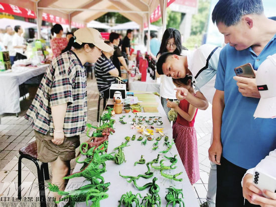 非遺展示區(qū)內(nèi),涪城綿陽米粉、游仙董氏扎染技藝、安州葫蘆烙畫、北川羌族草編、三臺郪江米花糖、梓潼糖畫、江油青蓮刺繡等近20項非遺手作體驗,吸引了許多市民駐足觀看。一位小朋友和父母一起來到北川羌族草編展臺前,看見栩栩如生的草編小動物,既喜歡,又害怕,最后在母親的鼓勵下,才和草編小動物來了一次親密的接觸,傳統(tǒng)非遺草編的魅力從此深深刻進了這位小朋友的腦海。