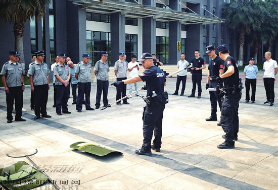 民警向企業(yè)安保人員講解防暴器材使用