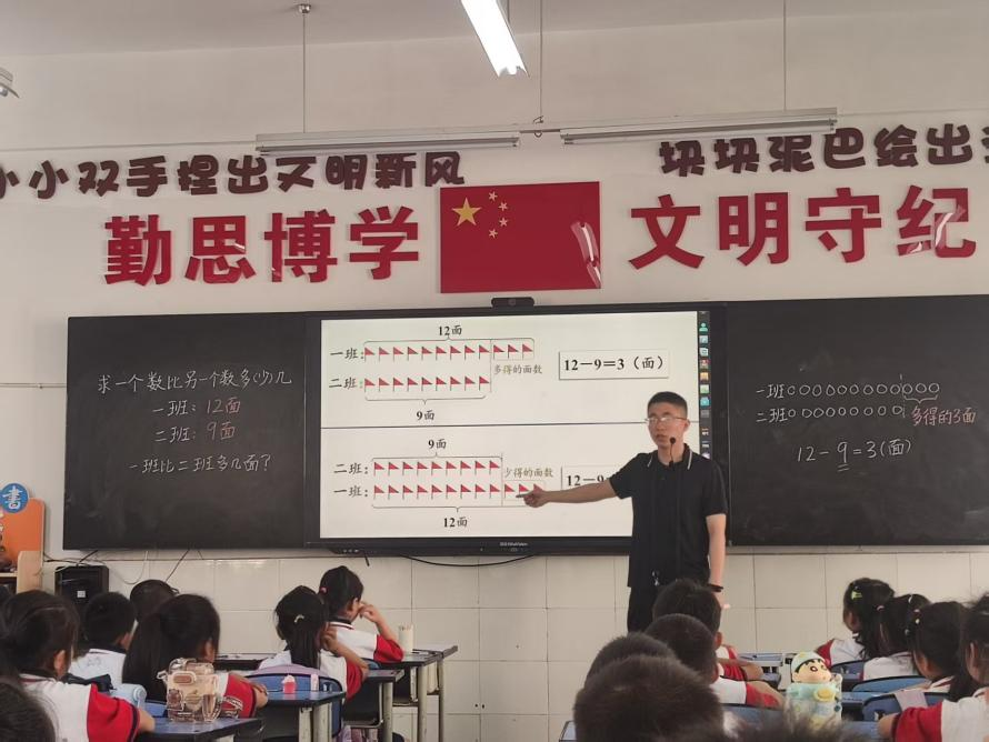 該校楊起帆老師在一年級(5)班執(zhí)教《求一個數(shù)比另一個數(shù)多(少)多少》校級名師示范課。本節(jié)課以“紅旗評比”生活情境切入,學(xué)生在畫圖探究的實踐操作中,經(jīng)歷“發(fā)現(xiàn)問題—畫圖建模—對比分析”的完整探究過程。教師通過動態(tài)呈現(xiàn)學(xué)生手繪的差異對比圖,引導(dǎo)他們自主發(fā)現(xiàn)“求差問題”中部分與整體的關(guān)系,將抽象的“多幾少幾”轉(zhuǎn)化為直觀的圖示語言。