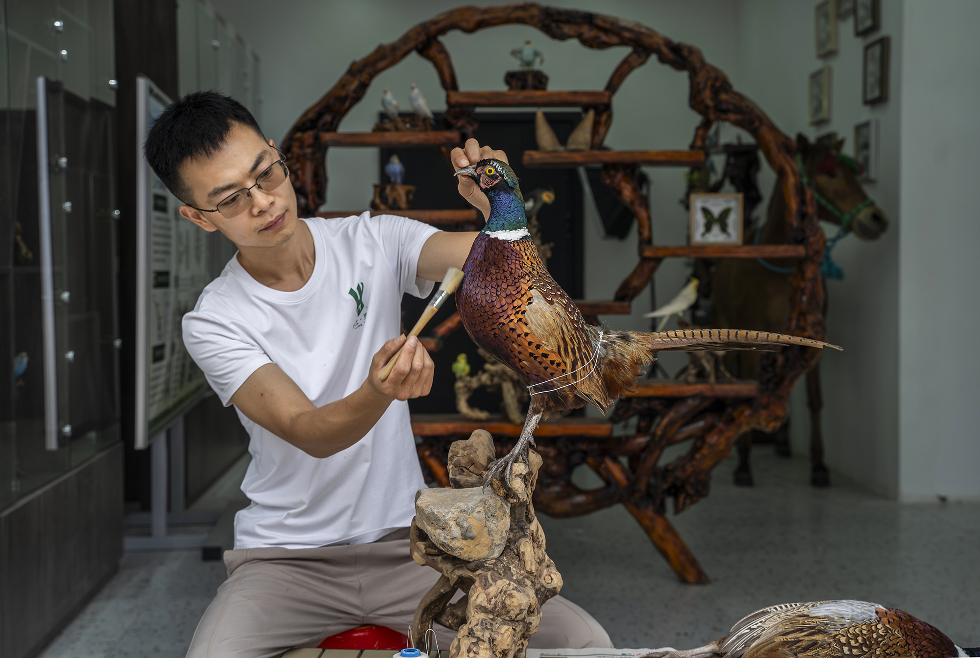“老人們玩轉(zhuǎn)繡花針,娃娃們給孔雀‘穿衣裳’,這手藝活就像是變魔術。”靈巖鎮(zhèn)黨委副書記陳江笑著掀開車間門簾,一只“錦雞”振翅欲飛,翎羽間躍動著細碎金光——這竟是用無數(shù)羽毛嫁接的標本。而在開江縣職業(yè)中學,工藝美術專業(yè)的學生正有模有樣地打磨根雕,將一只只活靈活現(xiàn)的小鳥標本移植到樹杈,“車間教室”標本作品琳瑯滿目。