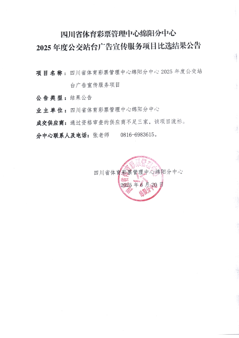四川省體育彩票管理中心綿陽分中心2025年度公交站臺(tái)廣告宣傳服務(wù)項(xiàng)目比選結(jié)果公告