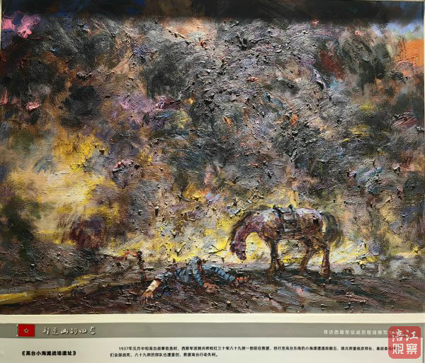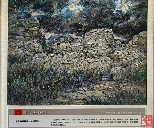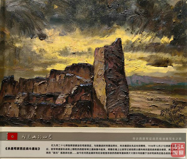 繪畫《石窩會議遺址》講述了1937年紅軍西路軍歷經(jīng)數(shù)月苦戰(zhàn),被迫轉(zhuǎn)移祁連山石窩鄉(xiāng),在3月14日傍晚召開“石窩會議”的歷史記憶;《永昌八壩狙擊戰(zhàn)遺址》再現(xiàn)的是1936年11月25日至28日,西路軍在永昌境內(nèi)取得唯一一次重大勝利的歷史;《西路軍最后一戰(zhàn)遺址》再現(xiàn)的是,西路紅軍于1937年4月突出重圍向西北轉(zhuǎn)移的歷史……