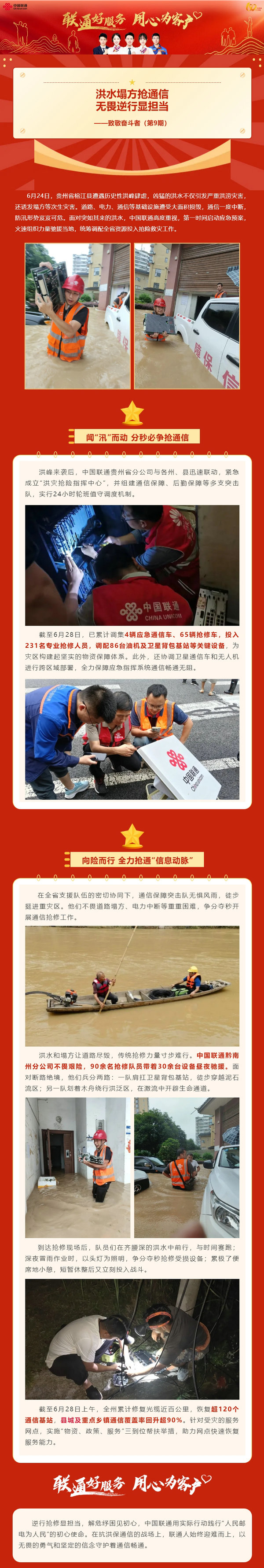 摘要:6月24日,貴州省榕江縣遭遇歷史性洪峰肆虐,兇猛的洪水不僅引發(fā)嚴(yán)重洪澇災(zāi)害,還誘發(fā)塌方等次生災(zāi)害。道路、電力、通信等基礎(chǔ)設(shè)施遭受大面積損毀,通信一度中斷,防汛形勢岌岌可危。面對突如其來的洪水,中國聯(lián)通高度重視,第一時間啟動應(yīng)急預(yù)案,火速組織力量馳援當(dāng)?shù)?,統(tǒng)籌調(diào)配全省資源投入搶險救災(zāi)工作。