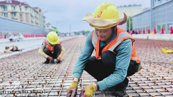 在三匯立交橋施工區(qū)現(xiàn)場,記者看到,橋下交通已恢復(fù),往來車輛依照地面交通標(biāo)線和信號燈有序通行。新的三匯立交橋主體已完工,工人們正在橋面進(jìn)行鋼筋綁扎、混凝土鋪設(shè)作業(yè)。