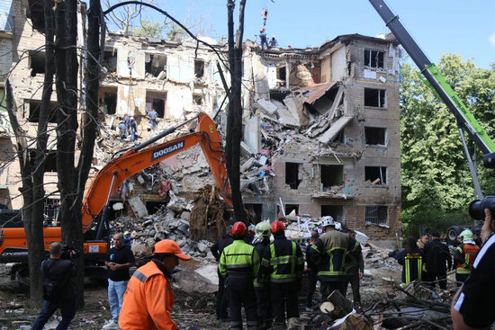 6月23日,烏克蘭國家緊急情況局工作人員在基輔市的舍甫琴科夫斯基區(qū)遭空襲現(xiàn)場進(jìn)行搜尋和清理工作。新華社發(fā)(彼得·德魯克攝)