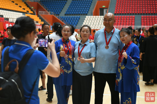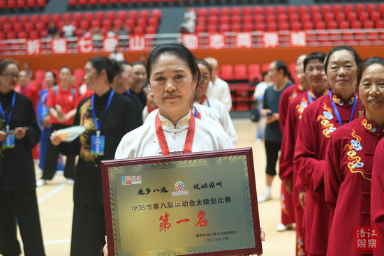 獲得四十二式太極劍集體項目冠軍的北川代表隊成員走下領(lǐng)獎臺,個個笑顏如花。“我們這一次奪冠,大家都非常激動和自豪,辛苦的付出獲得了收獲。”北川代表隊教練王春蓉告訴記者,團(tuán)隊共9個成員,平均年齡在60多歲,最大的68歲,最小的58歲,從三個月前就開始備戰(zhàn)。