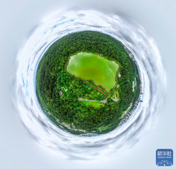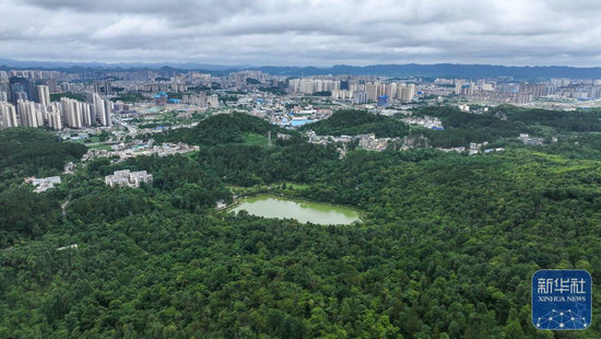 ↑這是7月1日拍攝的貴陽市長(zhǎng)坡嶺國(guó)有林場(chǎng)一角(無人機(jī)全景照片)。