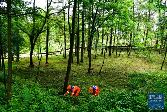 ↑7月1日,護(hù)林員在貴陽市長(zhǎng)坡嶺國(guó)有林場(chǎng)清除林下雜草,準(zhǔn)備套種繡球花。