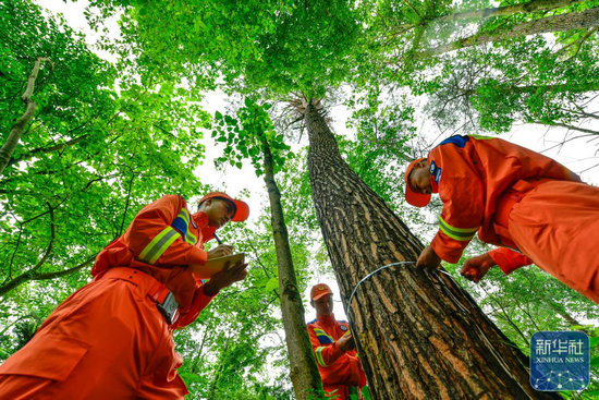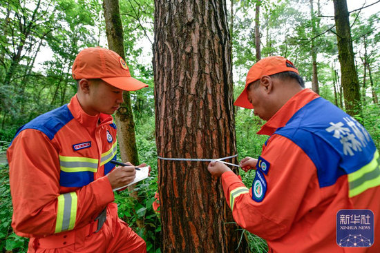 ↑7月1日,護(hù)林員在貴陽市長(zhǎng)坡嶺國(guó)有林場(chǎng)測(cè)量樹干。