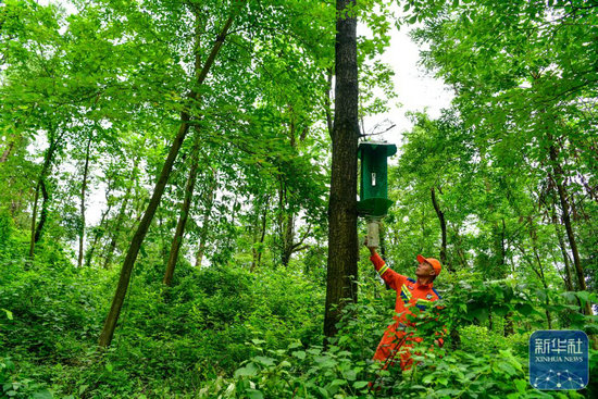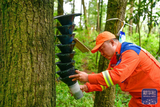 ↑7月1日,護(hù)林員在貴陽市長(zhǎng)坡嶺國(guó)有林場(chǎng)查看病蟲害防治誘捕器監(jiān)測(cè)情況。