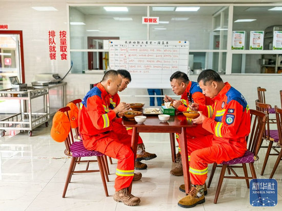 ↑7月1日,貴陽市長(zhǎng)坡嶺國(guó)有林場(chǎng)的護(hù)林員巡山歸來,在職工食堂吃午餐。