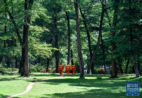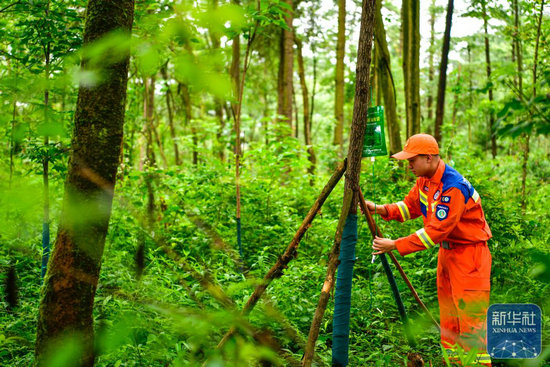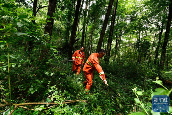↑7月1日,護(hù)林員在貴陽市長(zhǎng)坡嶺國(guó)有林場(chǎng)巡護(hù)山林。