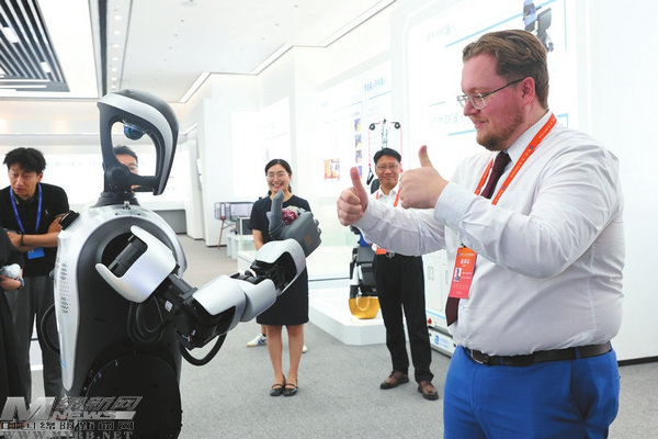 在科技城機器人智能制造產業(yè)園展廳,參觀的客人與機器人互動。視覺綿陽資料圖