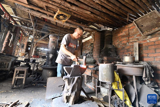 7月16日,廣西隆安縣雁江鎮(zhèn)紅良村,村民凌維軍在自己的作坊里打制鐵具。