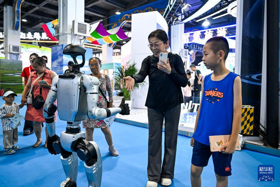 7月17日,觀眾在第九屆內(nèi)蒙古自治區(qū)文化產(chǎn)業(yè)博覽交易會現(xiàn)場與機(jī)器人互動。