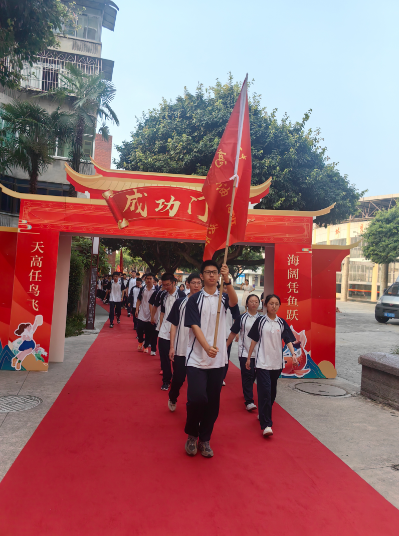 最激動人心的環(huán)節(jié)到來!各班在班主任的帶領(lǐng)下,旗手高擎班旗,學子們步伐堅定,依次邁過象征著奮斗與成長的“高三門”。教學樓上懸掛的勵志條幅迎風招展,這一刻,每一步都是承諾,每一秒都是誓言!