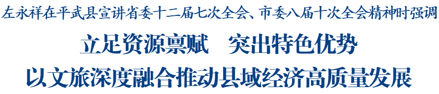 學(xué)習(xí)宣傳貫徹省委十二屆七次全會、市委八屆十次全會精神,是全市上下當前和今后一個時期的重要政治任務(wù)。左永祥認真聽取平武縣推動文旅深度融合發(fā)展情況介紹,并宣講省委十二屆七次全會、市委八屆十次全會精神。他說,推進文化和旅游深度融合發(fā)展,對于增強文化自信、服務(wù)人民群眾美好生活、促進高質(zhì)量發(fā)展具有重大意義。平武縣生態(tài)環(huán)境優(yōu)美、文旅資源富集,推進文旅融合發(fā)展有基礎(chǔ)、有條件、有潛力。要把省委、市委全會各項部署要求轉(zhuǎn)化為實實在在的舉措,把推進文化和旅游深度融合發(fā)展擺在更加突出的位置,進一步增強緊迫感,搶抓發(fā)展機遇、持續(xù)對標補短,用好優(yōu)質(zhì)自然生態(tài)資源和特色優(yōu)勢資源,找準定位、理清思路,走好差異化發(fā)展路子,扎實推進重點文旅項目建設(shè),優(yōu)化“吃住行游購娛”一站式服務(wù),加快把文化旅游業(yè)打造成為支柱產(chǎn)業(yè)、民生產(chǎn)業(yè)、幸福產(chǎn)業(yè)。要把學(xué)習(xí)貫徹省委、市委全會精神與做好當前工作結(jié)合起來,統(tǒng)籌做好抓項目、擴投資、促消費、惠民生、保安全等重點工作,堅定不移實現(xiàn)全年經(jīng)濟社會發(fā)展目標,為全市發(fā)展大局作出應(yīng)有貢獻?! ?/p>