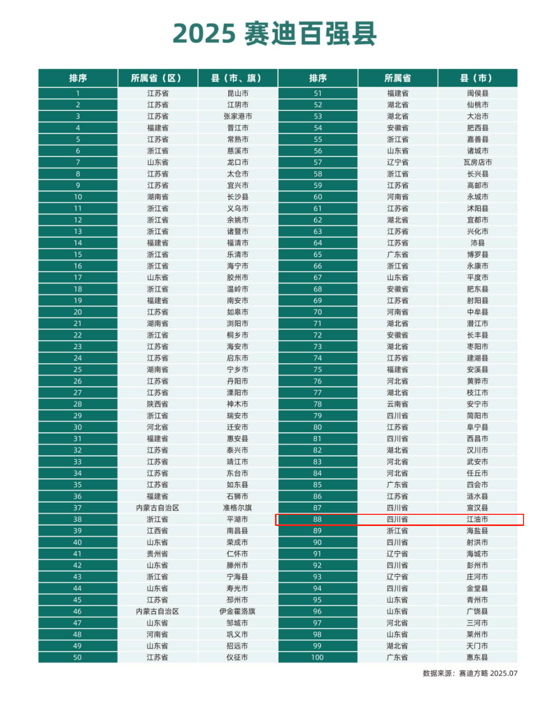 7月23日,2025縣域經(jīng)濟(jì)創(chuàng)新發(fā)展論壇在北京舉辦,會(huì)上發(fā)布了《2025中國縣域經(jīng)濟(jì)高質(zhì)量發(fā)展研究》研究成果,在評(píng)選出的2025年全國百強(qiáng)縣名單中,江油市上榜,也是綿陽唯一入選縣市。