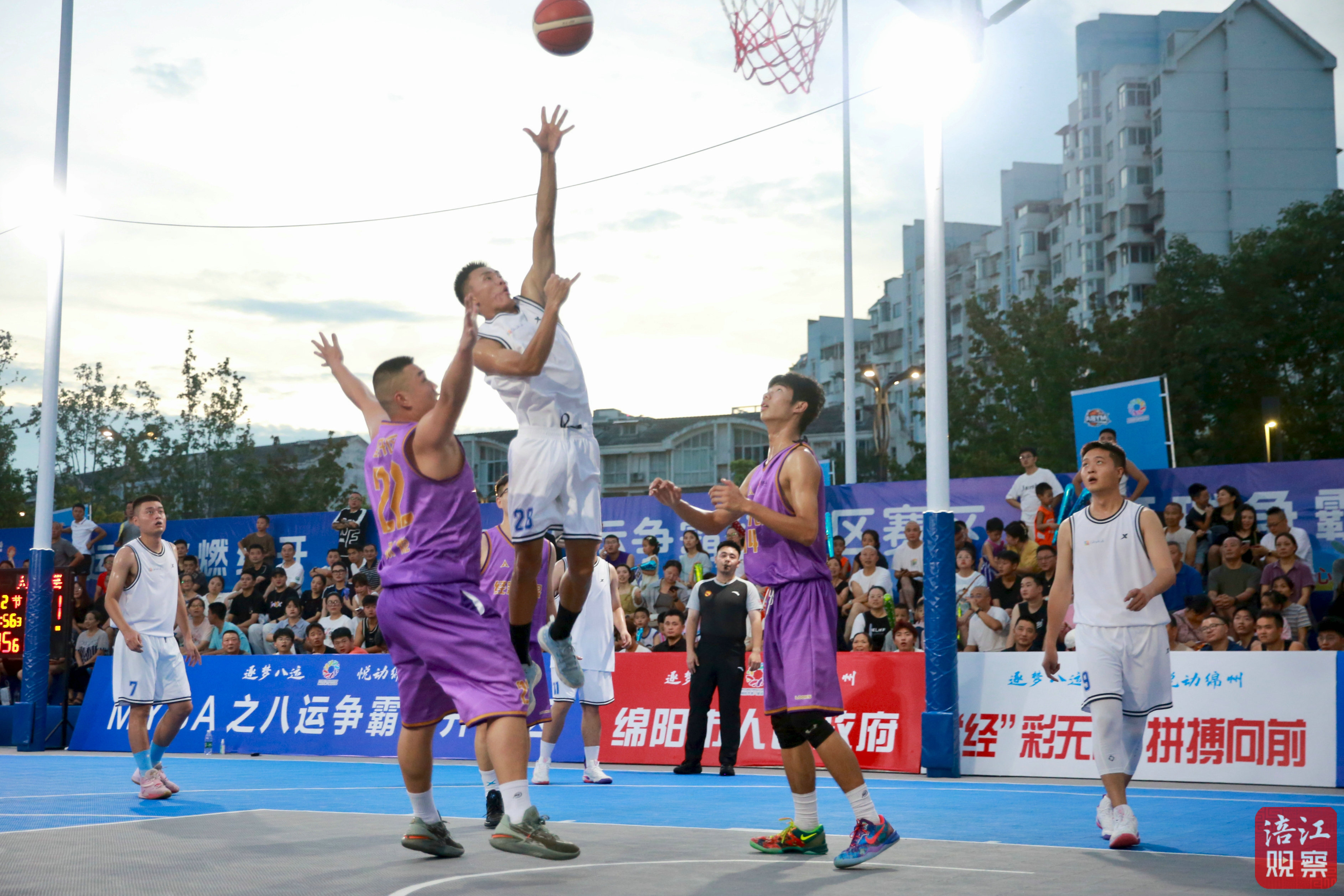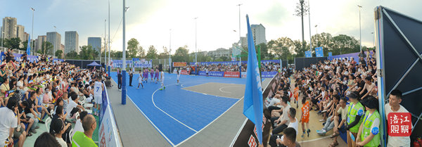 夏日的炎熱阻擋不了群眾的熱情。18時,距比賽還有1個半小時,觀眾們陸續(xù)排隊進場,敲打充氣棍、揮舞旗幟,將賽前緊張氛圍“拉滿”。19時30分,隨著裁判的哨子聲響,籃球場上的戰(zhàn)火一觸即燃,“經(jīng)”彩無限隊率先進入狀態(tài),打出6比0的開局。隨后,“經(jīng)”彩無限隊?wèi){借籃板優(yōu)勢繼續(xù)擴大比分,以33比11領(lǐng)先進入第二節(jié)。