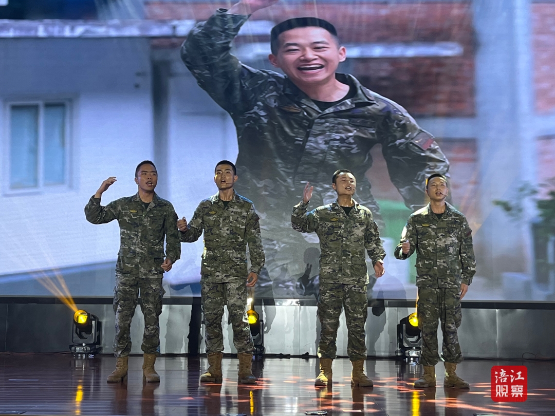 “紅星閃閃,放光彩;紅星燦燦,暖胸懷……”18時(shí)30分,晚會(huì)在《閃閃紅星》歌舞演繹中拉開(kāi)序幕。武警綿陽(yáng)支隊(duì)北川中隊(duì)的戰(zhàn)士們表演了情景朗誦《大山里的六班》,展現(xiàn)了武警官兵扎根山區(qū)默默奉獻(xiàn)的高貴品質(zhì)。