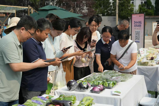 市民正在市集上通過掃描“JN碼”了解蔬菜信息。新華社發(fā)