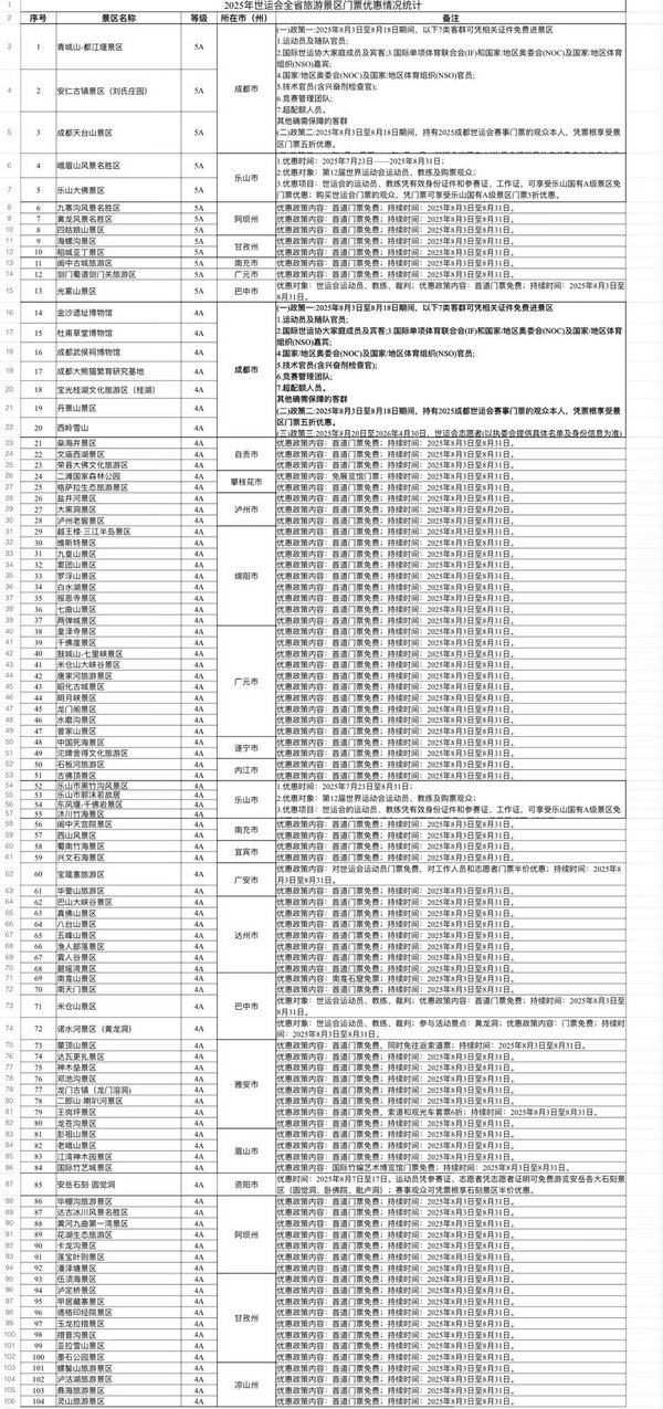 四川104家A級景區(qū)推出世運(yùn)會優(yōu)惠政策。點(diǎn)擊看大圖