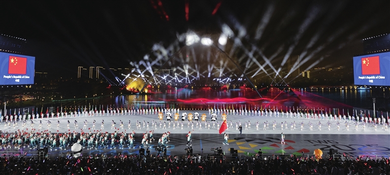 8月7日,中國(guó)體育代表團(tuán)在開幕式上入場(chǎng)。當(dāng)日,第12屆世界運(yùn)動(dòng)會(huì)開幕式在成都舉行。 新華社記者 陳益宸 攝