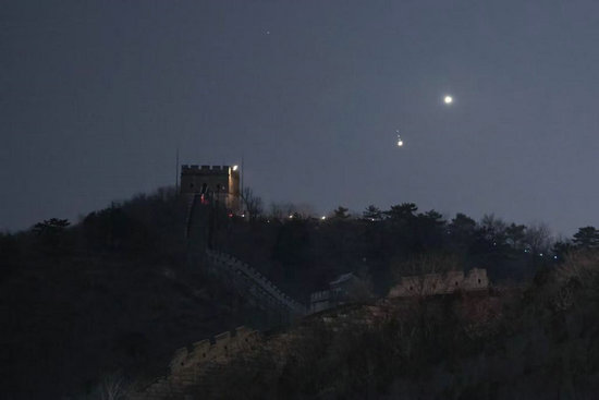 2023年3月2日,在北京懷柔區(qū)水長(zhǎng)城拍攝的金(右上)木(左下)極近。(周博 攝)