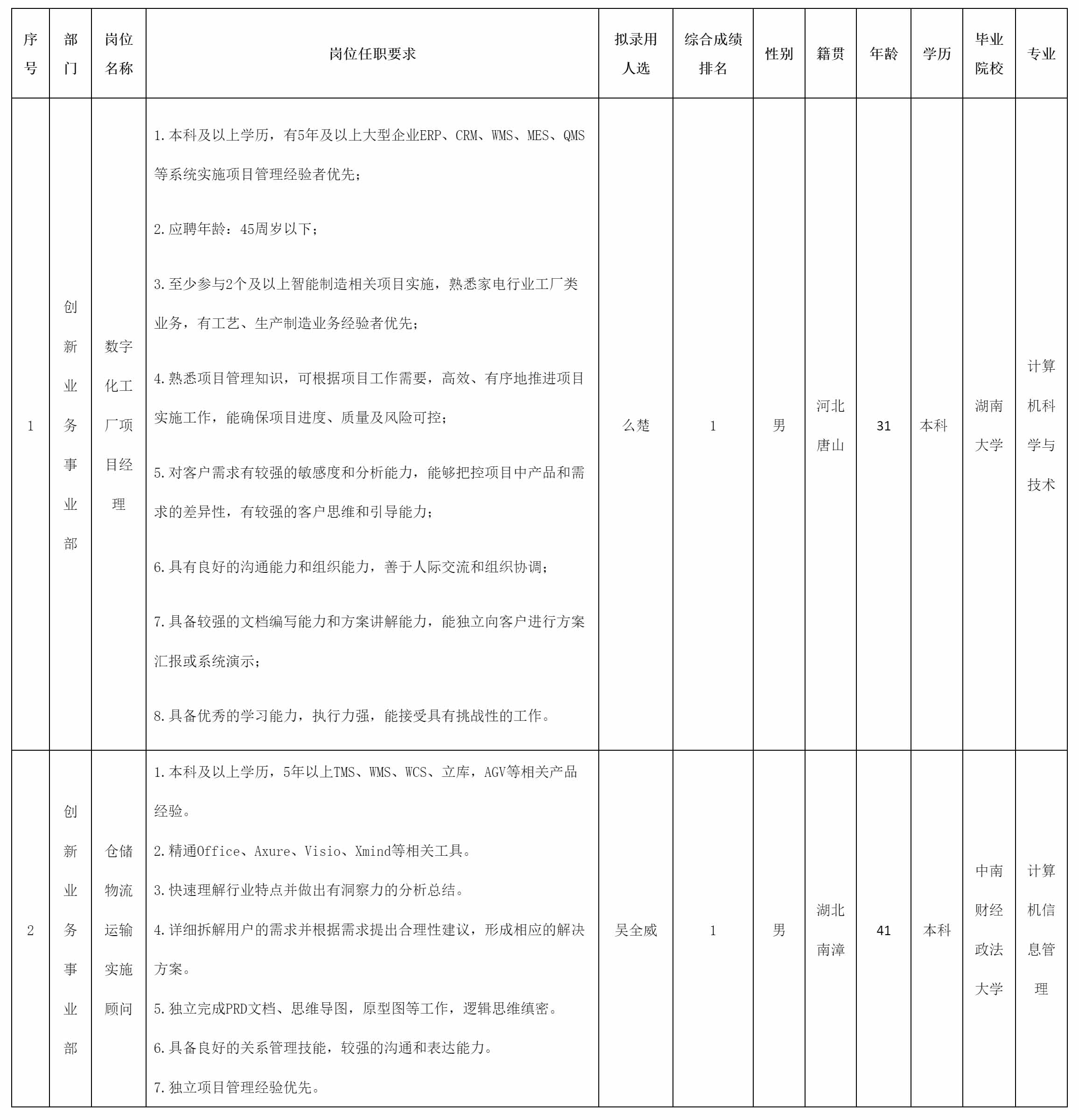 根據(jù)四川虹信軟件股份有限公司發(fā)布的招聘公告及招聘相關(guān)規(guī)定,經(jīng)面試、考察、體檢等程序,擬錄用么楚、吳全威同志到四川虹信軟件股份有限公司工作,現(xiàn)予以公示,具體情況如下: