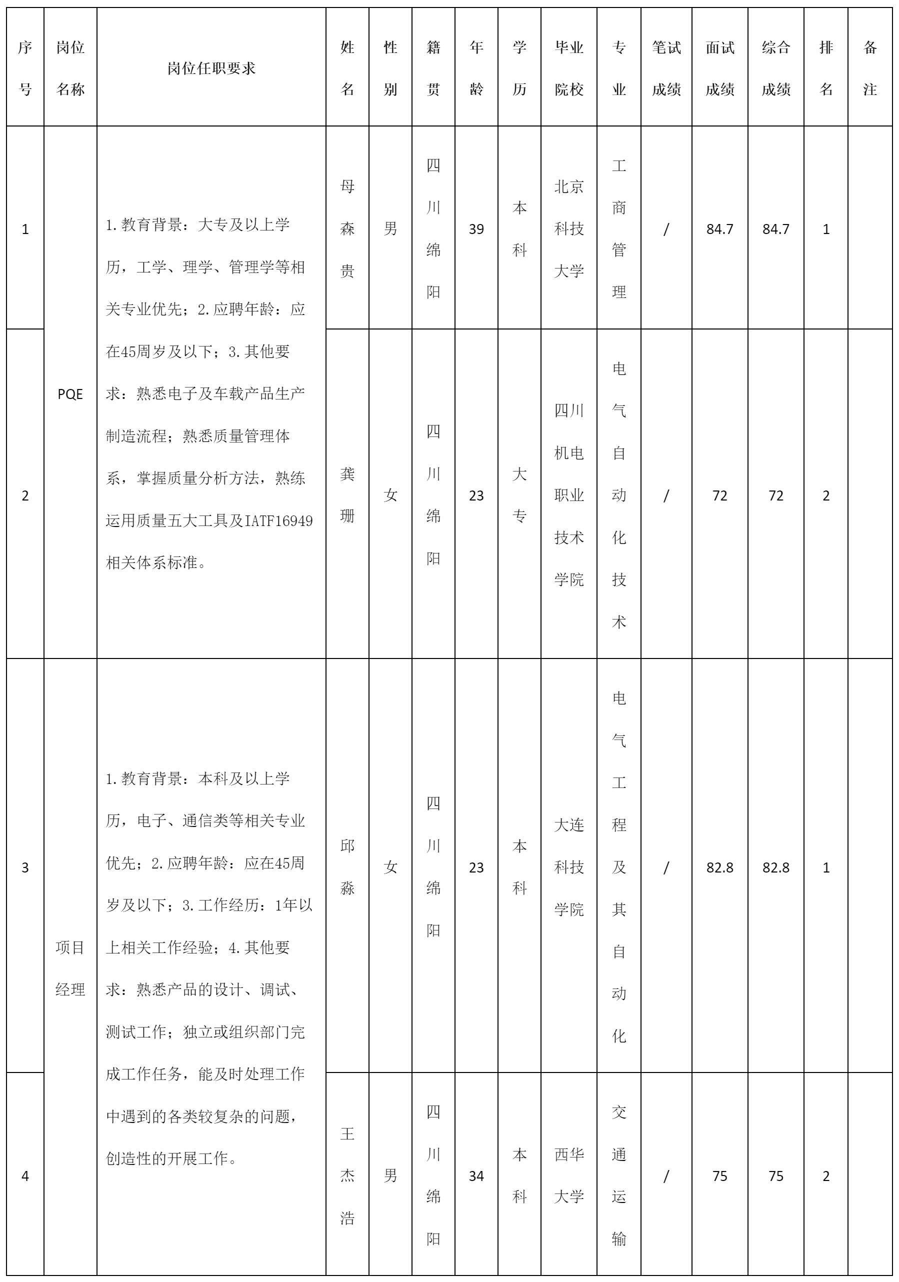 根據(jù)四川九州電子科技股份有限公司發(fā)布的招聘公告及招聘相關規(guī)定,經(jīng)筆試、面試等程序,現(xiàn)將筆試(面試)成績予以公示。