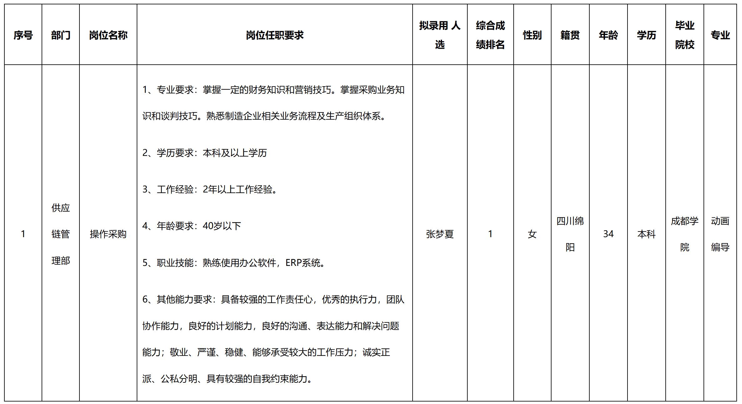 根據四川愛創(chuàng)科技有限公司發(fā)布的招聘公告及招聘相關規(guī)定,經面試、考察、體檢等程序,擬錄用張夢夏同志到供應鏈管理部工作,現(xiàn)予以公示,具體情況如下: