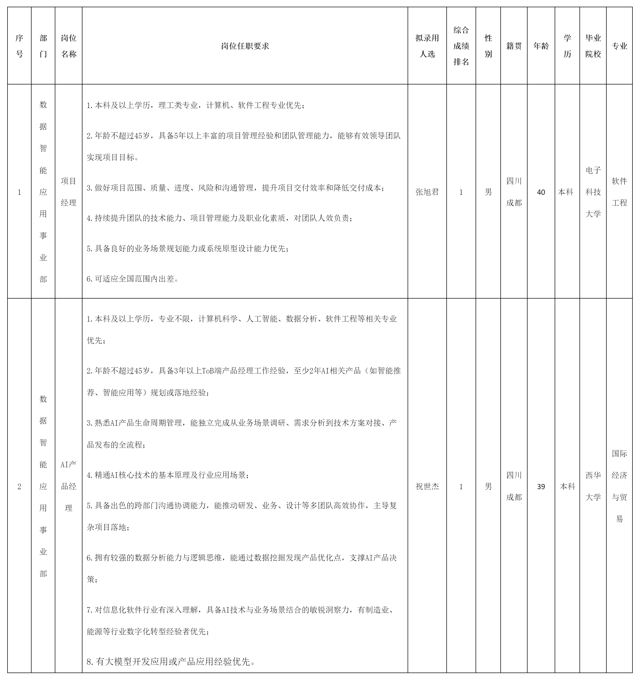 根據(jù)四川虹信軟件股份有限公司發(fā)布的招聘公告及招聘相關規(guī)定,經(jīng)面試、考察、體檢等程序,擬錄用張旭君、祝世杰同志到四川虹信軟件股份有限公司工作,現(xiàn)予以公示,具體情況如下: