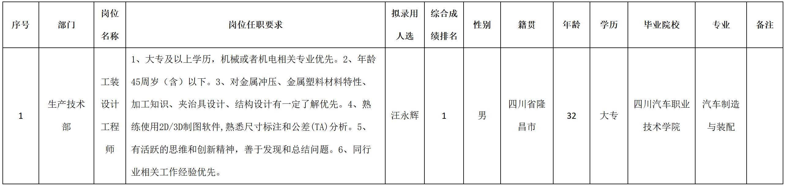 根據(jù)四川安和精密電子電器股份有限公司發(fā)布的招聘公告及招聘相關(guān)規(guī)定,經(jīng)筆試、面試、考察、體檢等程序,擬錄用汪永輝同志到四川安和精密電子電器股份有限公司工作,現(xiàn)予以公示,具體情況如下: