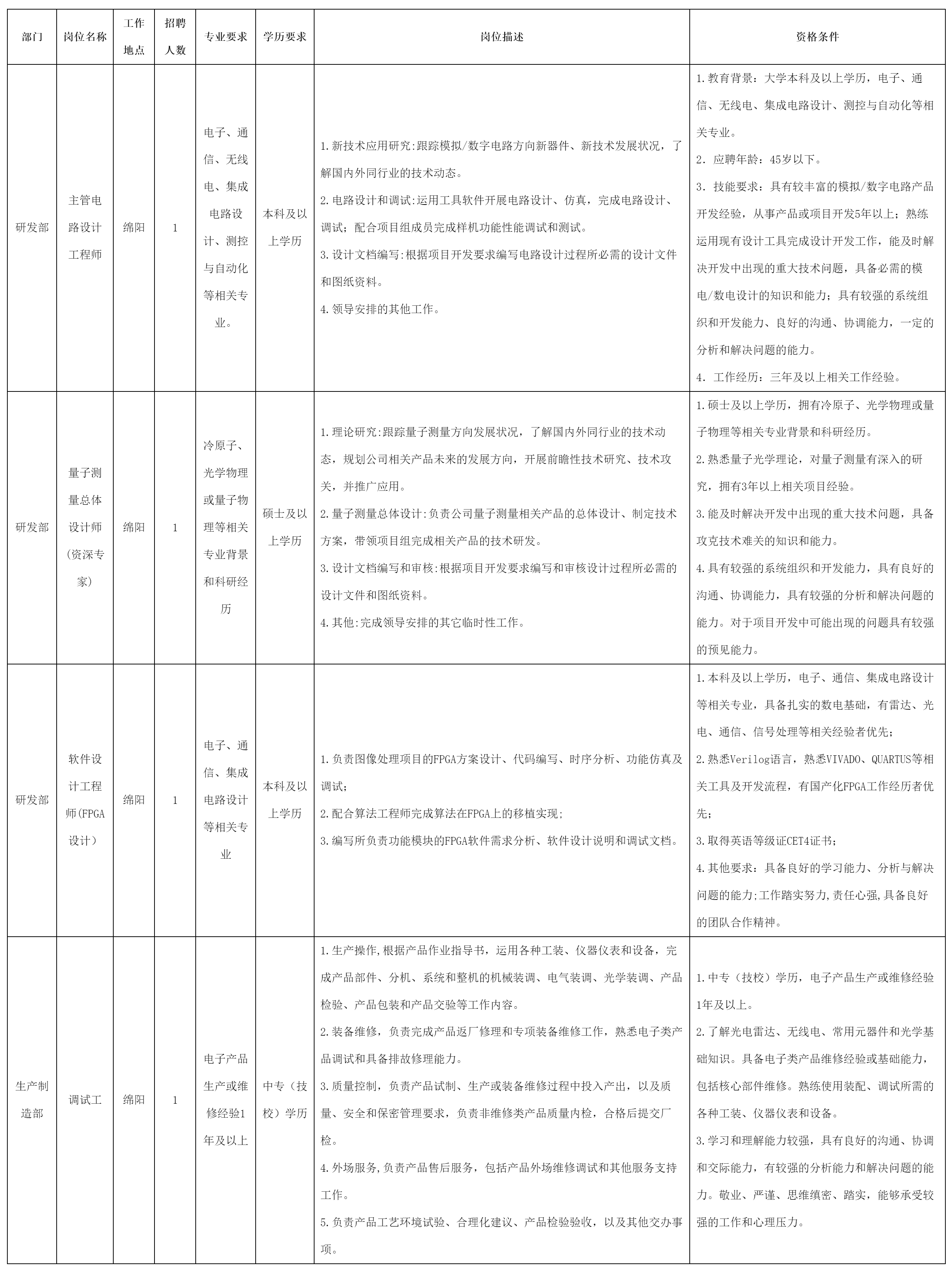 四川長虹電子科技有限公司(國營第七八〇廠)始建于1958年,是國家“一五”期間的156個重點項目之一,是我國第一個機(jī)載火控雷達(dá)科研生產(chǎn)基地,位于綿陽市經(jīng)濟(jì)技術(shù)開發(fā)區(qū)。公司注冊資本1.7億元人民幣,為國有獨資企業(yè)。公司主要從事重力測量、光電探測和光電告警領(lǐng)域產(chǎn)品研發(fā)和生產(chǎn)。因業(yè)務(wù)發(fā)展需要,現(xiàn)誠聘英才,招聘崗位及要求如下: