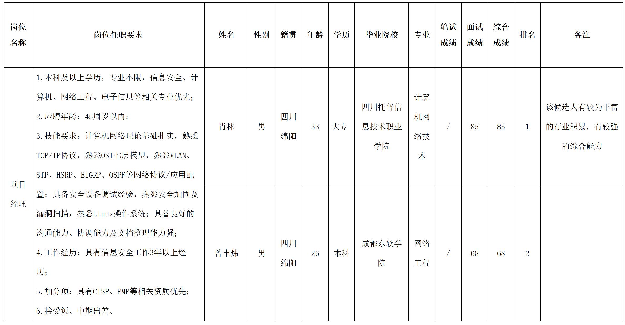根據(jù)四川虹信軟件股份有限公司發(fā)布的招聘公告及招聘相關(guān)規(guī)定,經(jīng)面試等程序,現(xiàn)將面試成績(jī)予以公示。