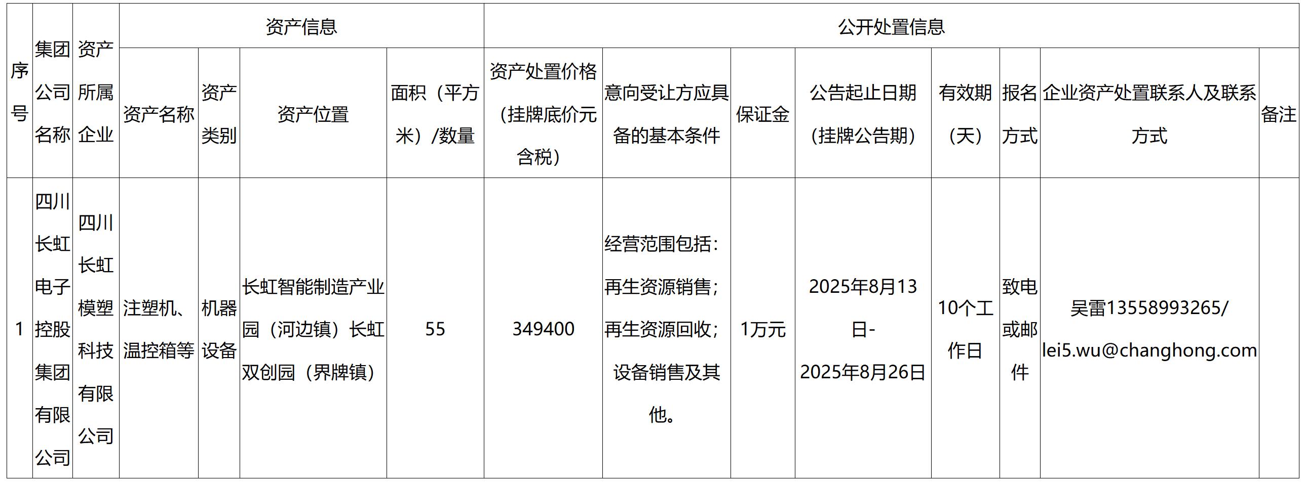 四川長虹模塑科技有限公司企業(yè)資產(chǎn)處置公告