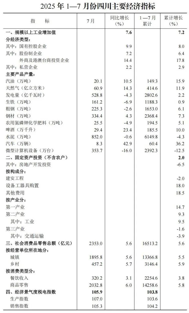 8月18日,四川省統(tǒng)計(jì)局發(fā)布2025年1—7月四川省國民經(jīng)濟(jì)主要指標(biāo)數(shù)據(jù)。數(shù)據(jù)顯示,1—7月,全省規(guī)模以上工業(yè)增加值同比增長7.2%,增速比全國快0.9個(gè)百分點(diǎn);全省實(shí)現(xiàn)社會消費(fèi)品零售總額16513.2億元,同比增長5.6%,增速比全國快0.8個(gè)百分點(diǎn)。