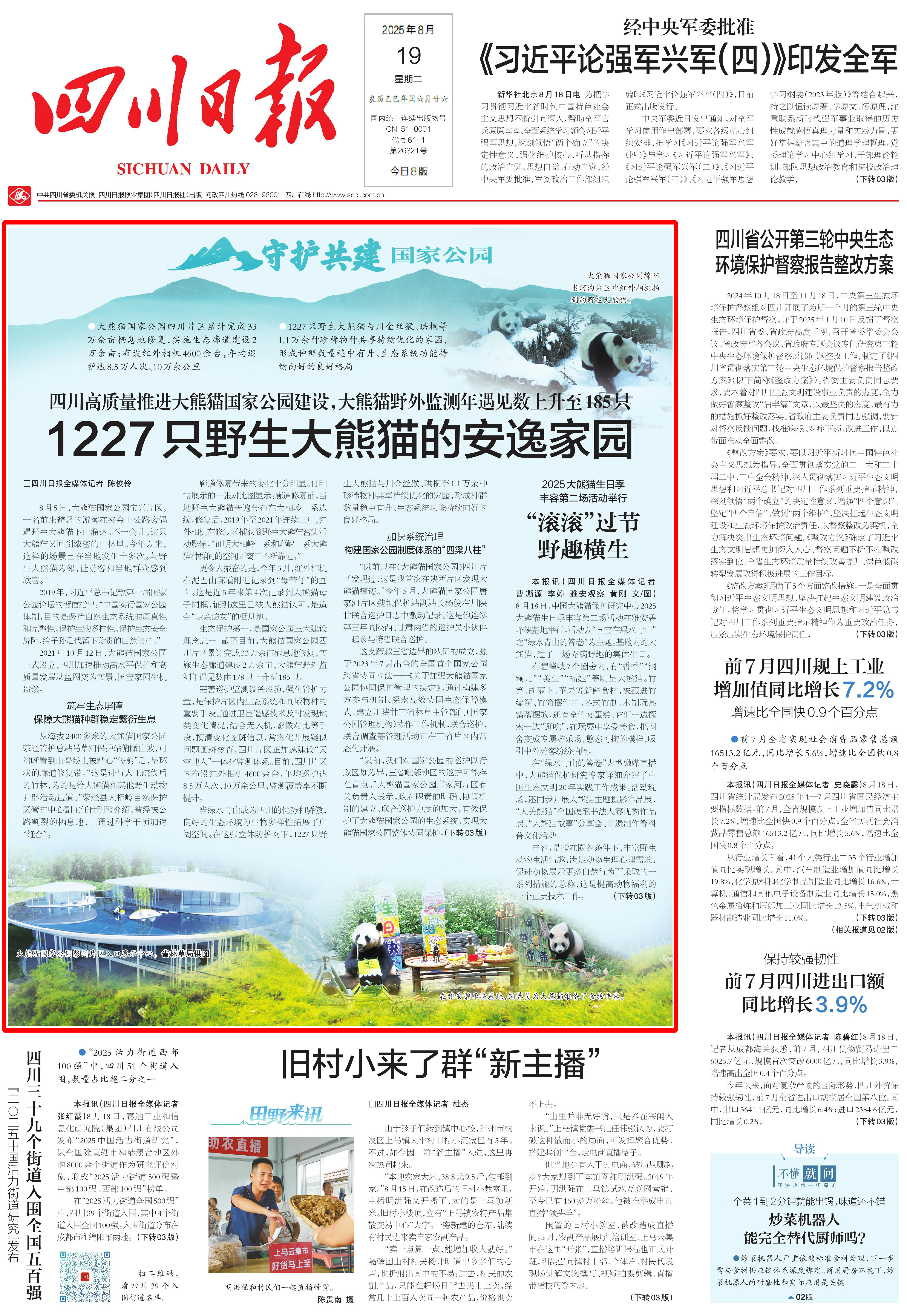 8月19日,《四川日報(bào)》頭版頭條刊發(fā)文章《四川高質(zhì)量推進(jìn)大熊貓國家公園建設(shè),大熊貓野外監(jiān)測年遇見數(shù)上升至185只 1227只野生大熊貓的安逸家園》,其中特別關(guān)注了大熊貓國家公園綿陽片區(qū),點(diǎn)贊平武縣將蜜蜂當(dāng)作綠水青山化作金山銀山的轉(zhuǎn)化器,生態(tài)保護(hù)與社區(qū)發(fā)展實(shí)現(xiàn)雙贏。