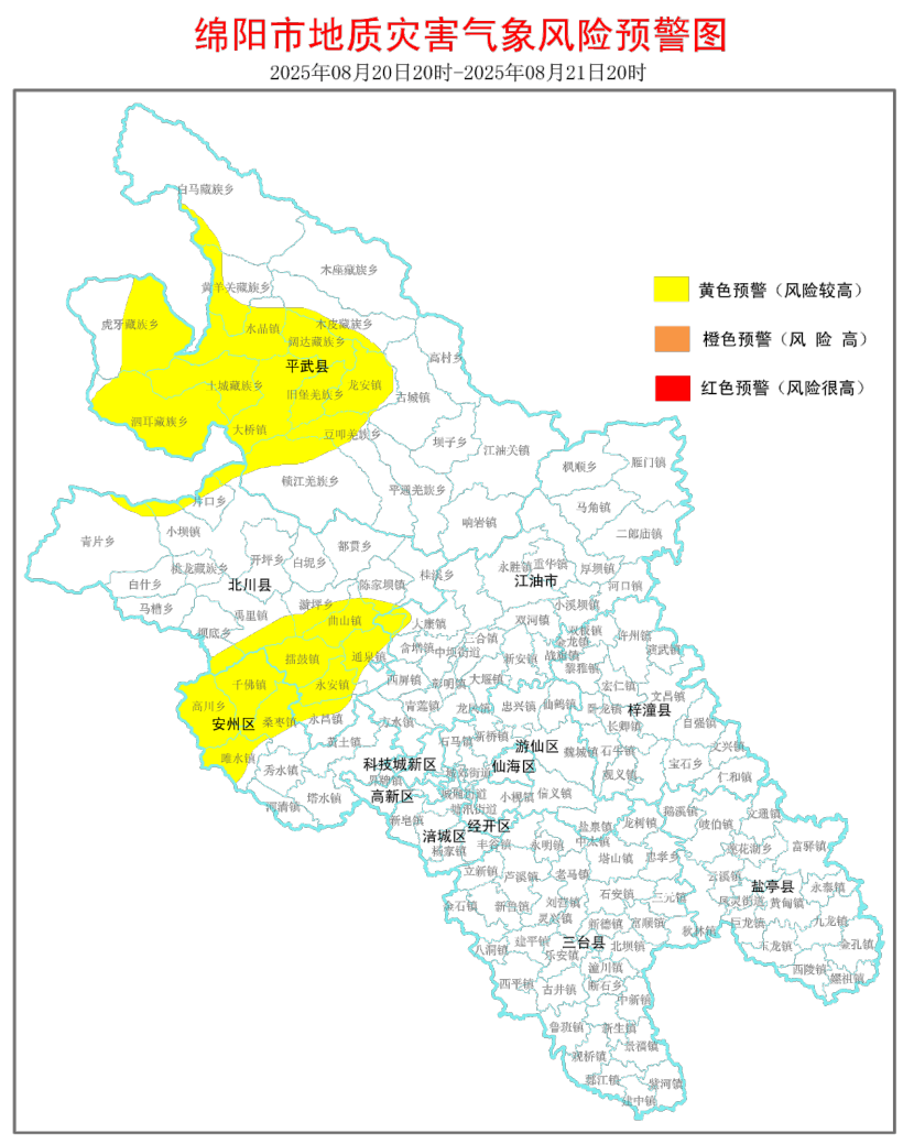 8月20日20時(shí)-8月21日20時(shí),綿陽以下地區(qū)發(fā)生地質(zhì)災(zāi)害的風(fēng)險(xiǎn)較高(黃色預(yù)警),請重點(diǎn)防范: