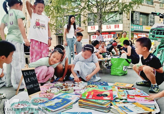 “小掌柜”萌萌的奶奶介紹,暑假期間看到有小朋友在小區(qū)廣場擺地攤,便加入了進來,“我們賣的多是自家書籍,價錢實惠,不買也能在現(xiàn)場一起看書,分享、傳遞這份快樂”。