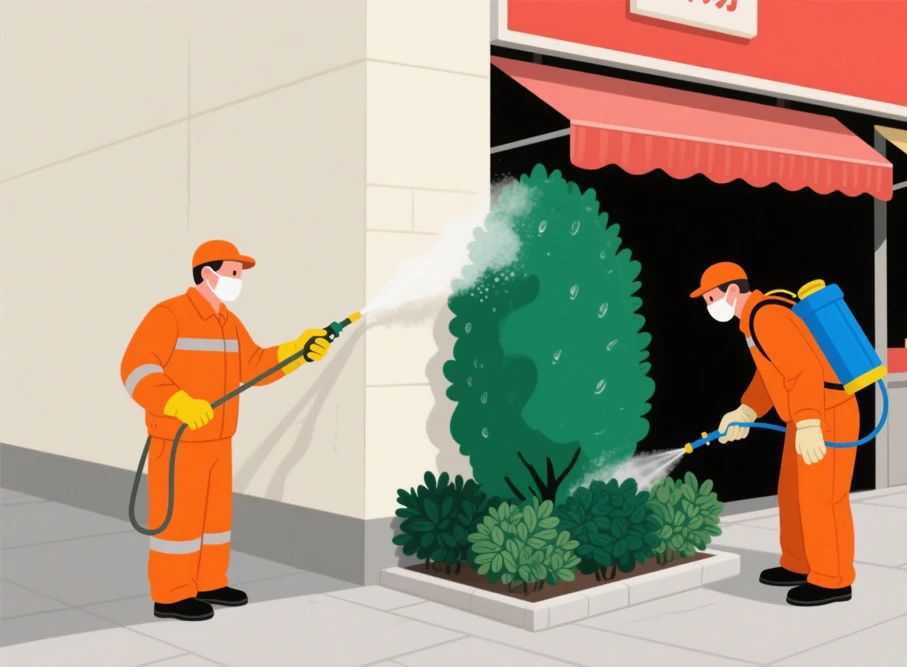 市場周邊綠化帶實(shí)施滯留噴灑,重點(diǎn)處理墻面、墻角及檔口下部陰暗處。綠化植被噴灑至2米以下高度,確保葉片背面均勻覆蓋藥液,每月至少處理一次。