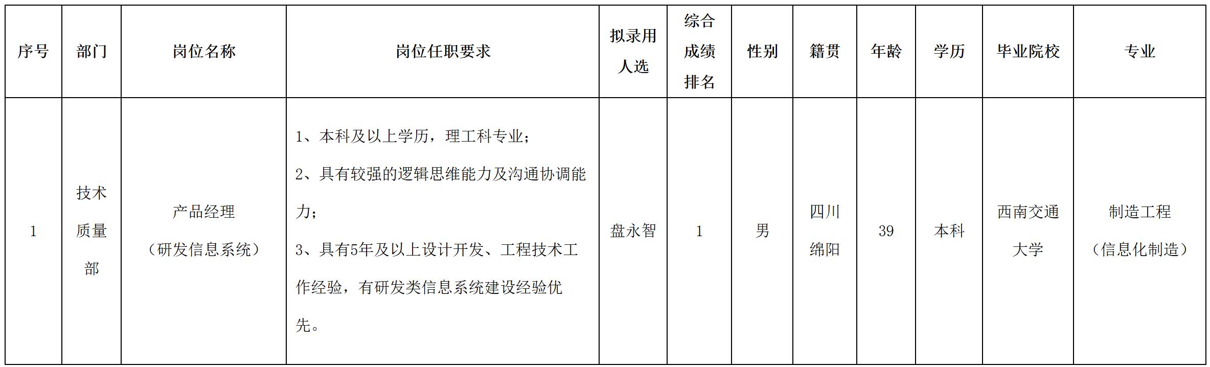 根據(jù)四川華豐科技股份有限公司發(fā)布的招聘公告及招聘相關(guān)規(guī)定,經(jīng)面試等程序,擬錄用盤(pán)永智同志到四川華豐科技股份有限公司工作,現(xiàn)予以公示,具體情況如下: