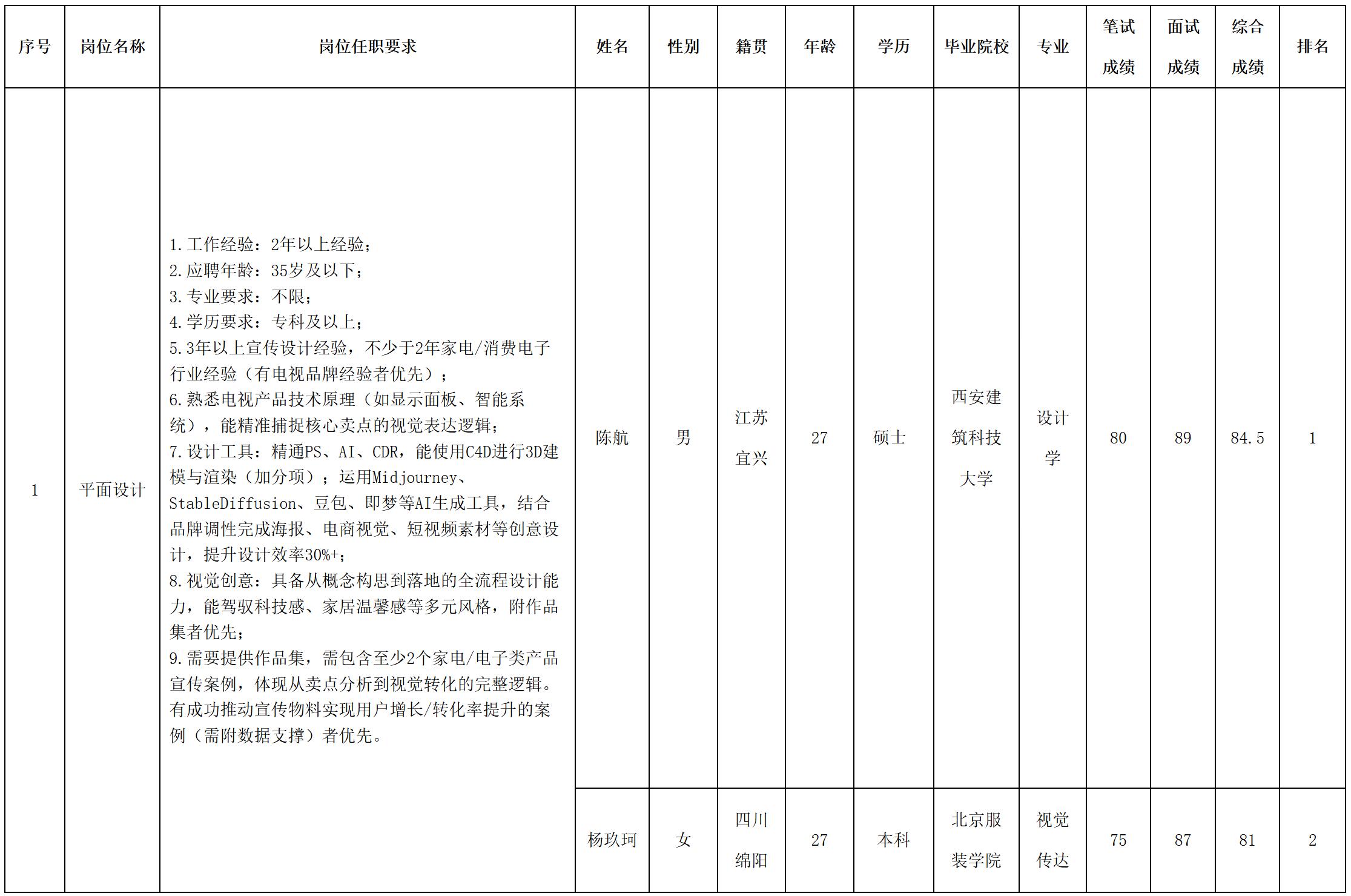 根據(jù)長虹·美菱中國區(qū)營銷總部發(fā)布的招聘公告及招聘相關(guān)規(guī)定,經(jīng)面試程序,現(xiàn)將面試成績予以公示。
