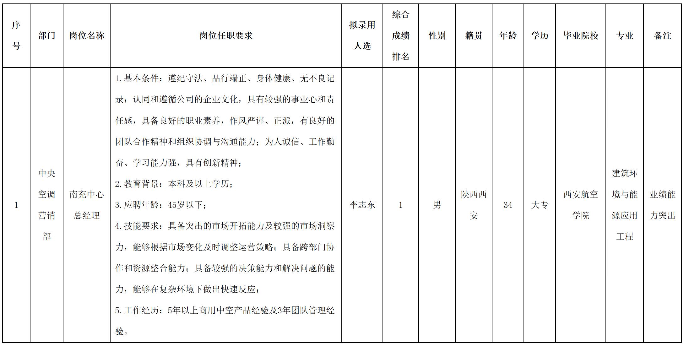 根據(jù)四川長虹空調(diào)有限公司發(fā)布的招聘公告及招聘相關(guān)規(guī)定,經(jīng)面試,擬錄用李志東到長虹空調(diào)工作,現(xiàn)予以公示,具體情況如下: