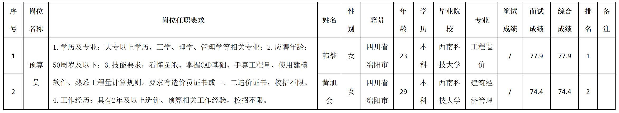 根據四川九洲建筑工程有限責任公司發(fā)布的招聘公告及招聘相關規(guī)定,經筆試、面試等程序,現將筆試(面試)成績予以公示。