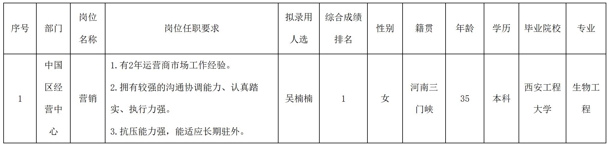 根據(jù)四川長(zhǎng)虹新網(wǎng)科技有限責(zé)任公司發(fā)布的招聘公告及招聘相關(guān)規(guī)定,經(jīng)筆試、面試、考察、體檢等程序,擬錄用吳楠楠同志到公司工作,現(xiàn)予以公示,具體情況如下: