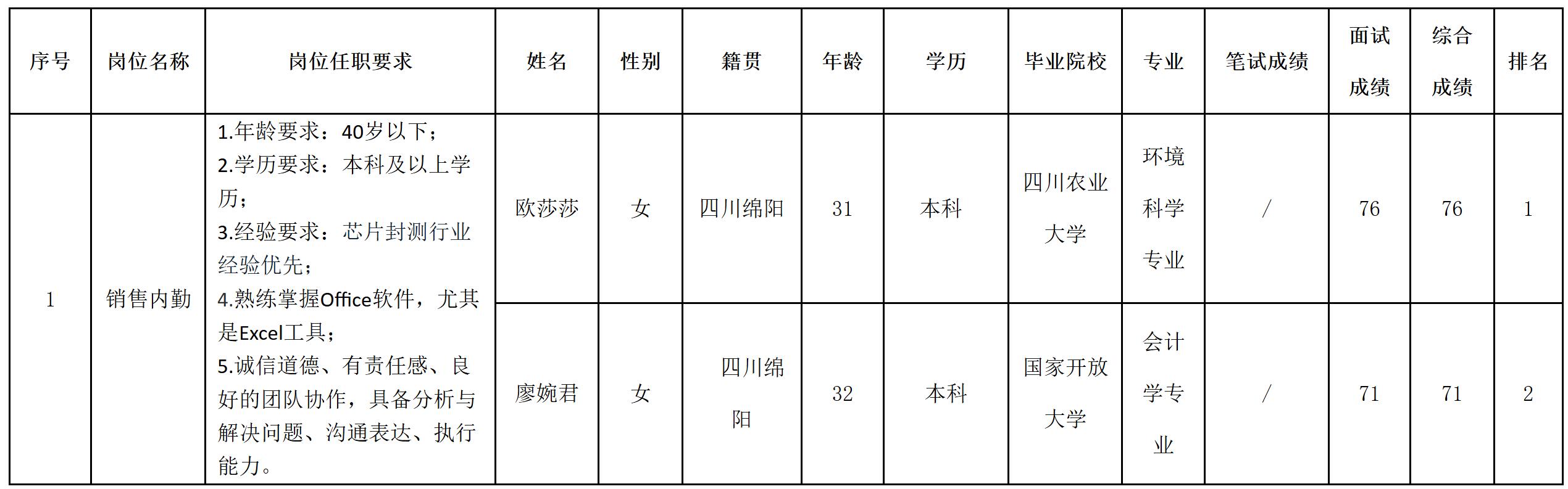 根據(jù)四川啟賽微電子有限公司發(fā)布的招聘公告及招聘相關(guān)規(guī)定,經(jīng)筆試、面試等程序,現(xiàn)將筆試(面試)成績(jī)予以公示。
