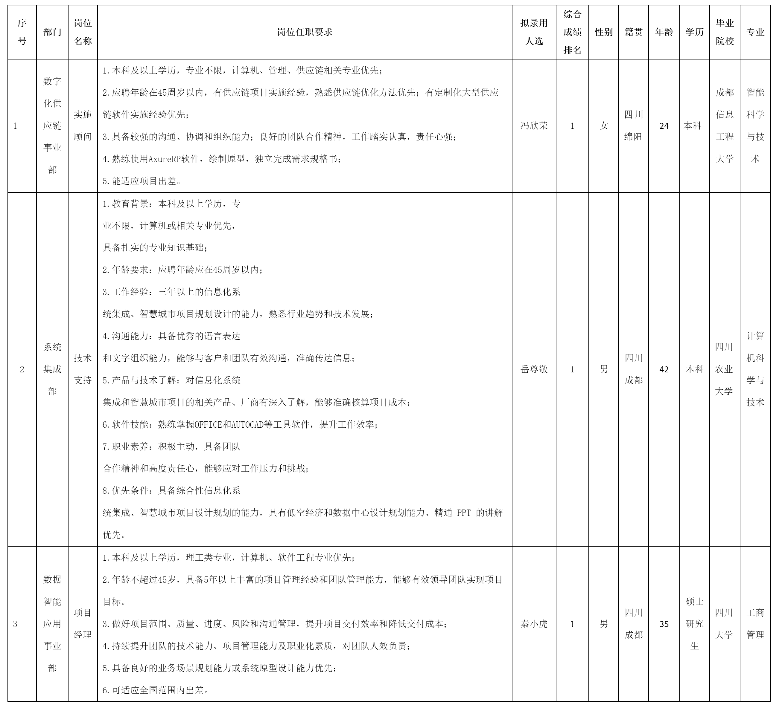 根據(jù)四川虹信軟件股份有限公司發(fā)布的招聘公告及招聘相關規(guī)定,經(jīng)面試、考察、體檢等程序,擬錄用馮欣榮、岳尊敬、秦小虎同志到四川虹信軟件股份有限公司工作,現(xiàn)予以公示,具體情況如下:
