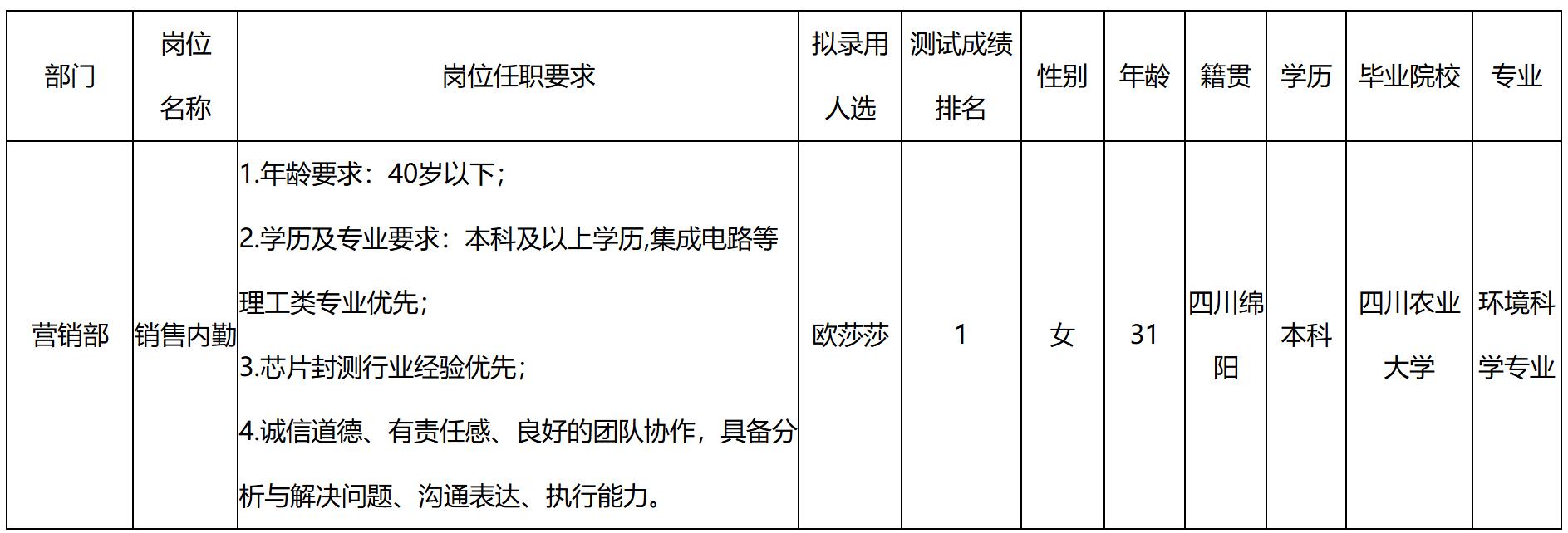 根據(jù)四川啟賽微電子有限公司發(fā)布的招聘公告及招聘相關(guān)規(guī)定,經(jīng)用人單位面試程序,擬錄用歐莎莎同志到四川啟賽微電子有限公司工作,現(xiàn)予以公示,具體情況如下: