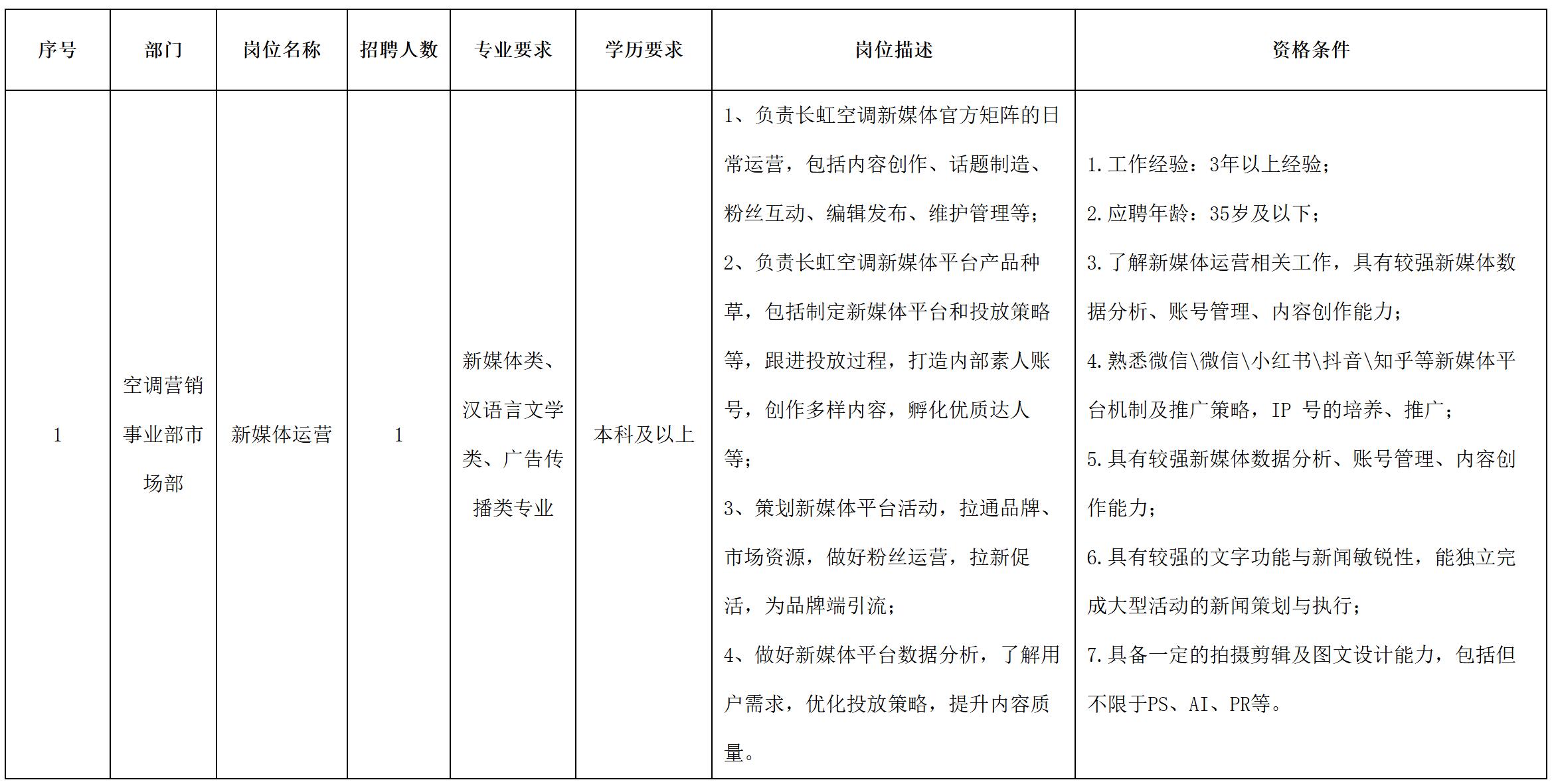 長虹·美菱中國區(qū)營銷總部是長虹集團旗下負責智慧家電產(chǎn)品營銷的管理平臺,主要經(jīng)營長虹&美菱品牌的電視、冰箱、洗衣機、空調(diào)等智慧家電,公司現(xiàn)有7000余名員工,全國設立24個營銷分部,是面向線上、線下全渠道統(tǒng)一的運營和服務平臺,致力于為用戶提供具有獨特價值的智慧家電產(chǎn)品。根據(jù)公司經(jīng)營發(fā)展需要,現(xiàn)面向長虹內(nèi)外部招聘以下崗位,具體招聘信息如下:
